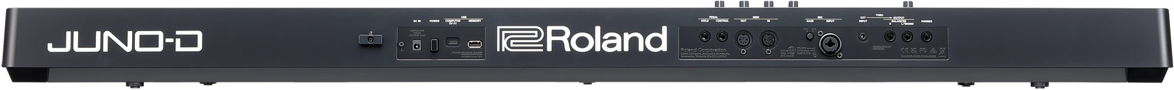 The Roland JUNO-D7 offers a wide range of connectivity options for versatile performance and production. It features 1/4″ L/Mono and R TRS audio output jacks for seamless integration with external sound systems, along with a 1/4″ stereo headphone jack for private monitoring.